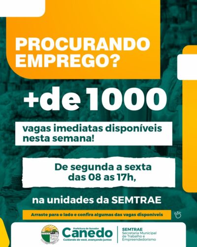 Prefeitura de Senador Canedo oferece mais de 1000 oportunidades de emprego para a população Prefeitura de Senador Canedo oferece mais de 1000 oportunidades de emprego para a população 10 de abril de 2024