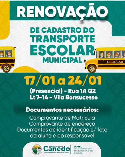 Garanta sua renovação do cadastramento do transporte escolar municipal Garanta sua renovação do cadastramento do transporte escolar municipal 20 de janeiro de 2024