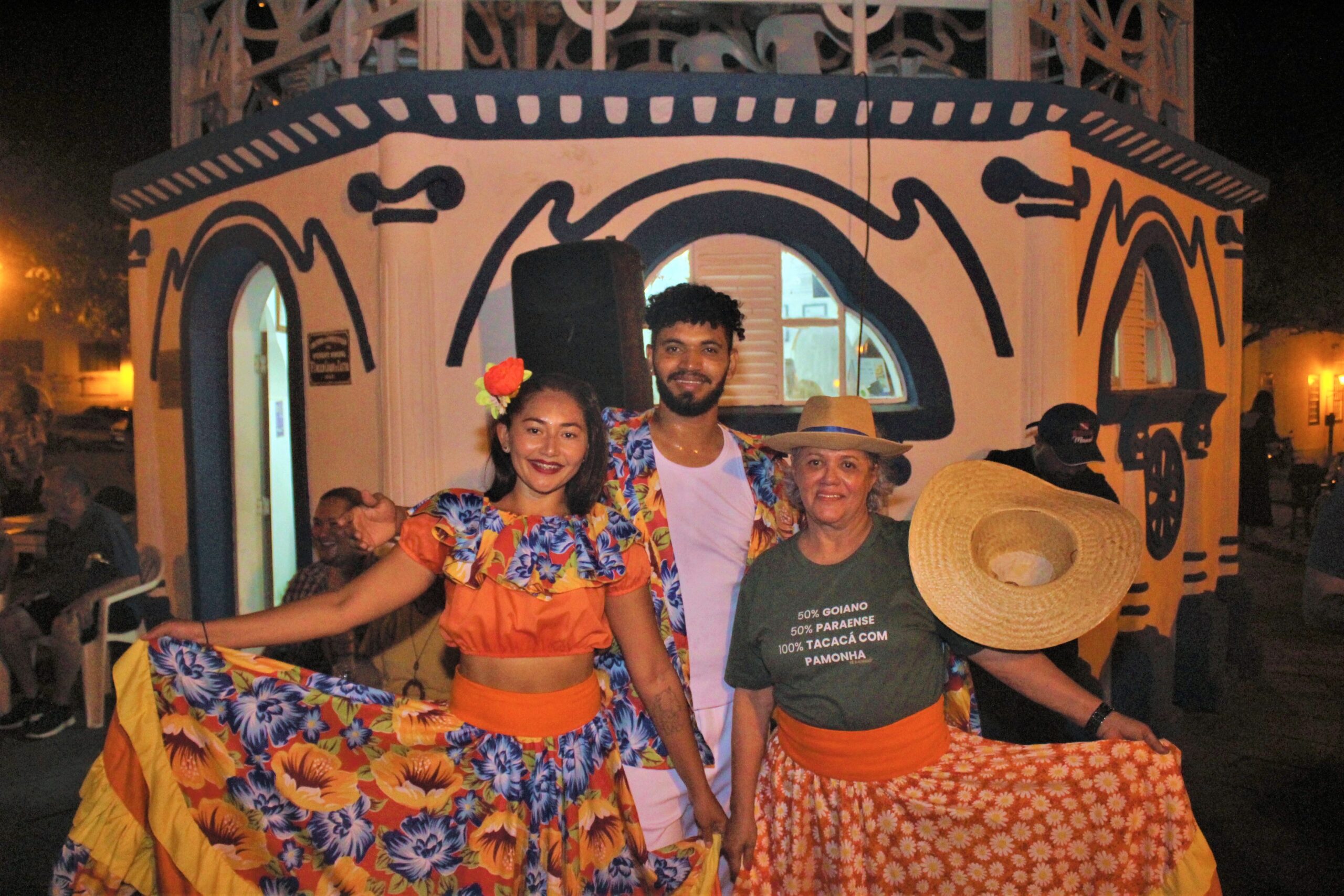No começo da noite de sexta-feira(15/08) a Praça do Coreto, na cidade de Goiás, foi cenário de um encontro cultural emocionante. O tradicional carimbó, dança típica do Pará, ganhou espaço em meio às ruas históricas da antiga capital, em uma apresentação conduzida pela primeira-dama de Xinguara, Fátima Coutinho Assunção, que trouxe o casal de dançarinos Israel Morais e Luciene Santos.
