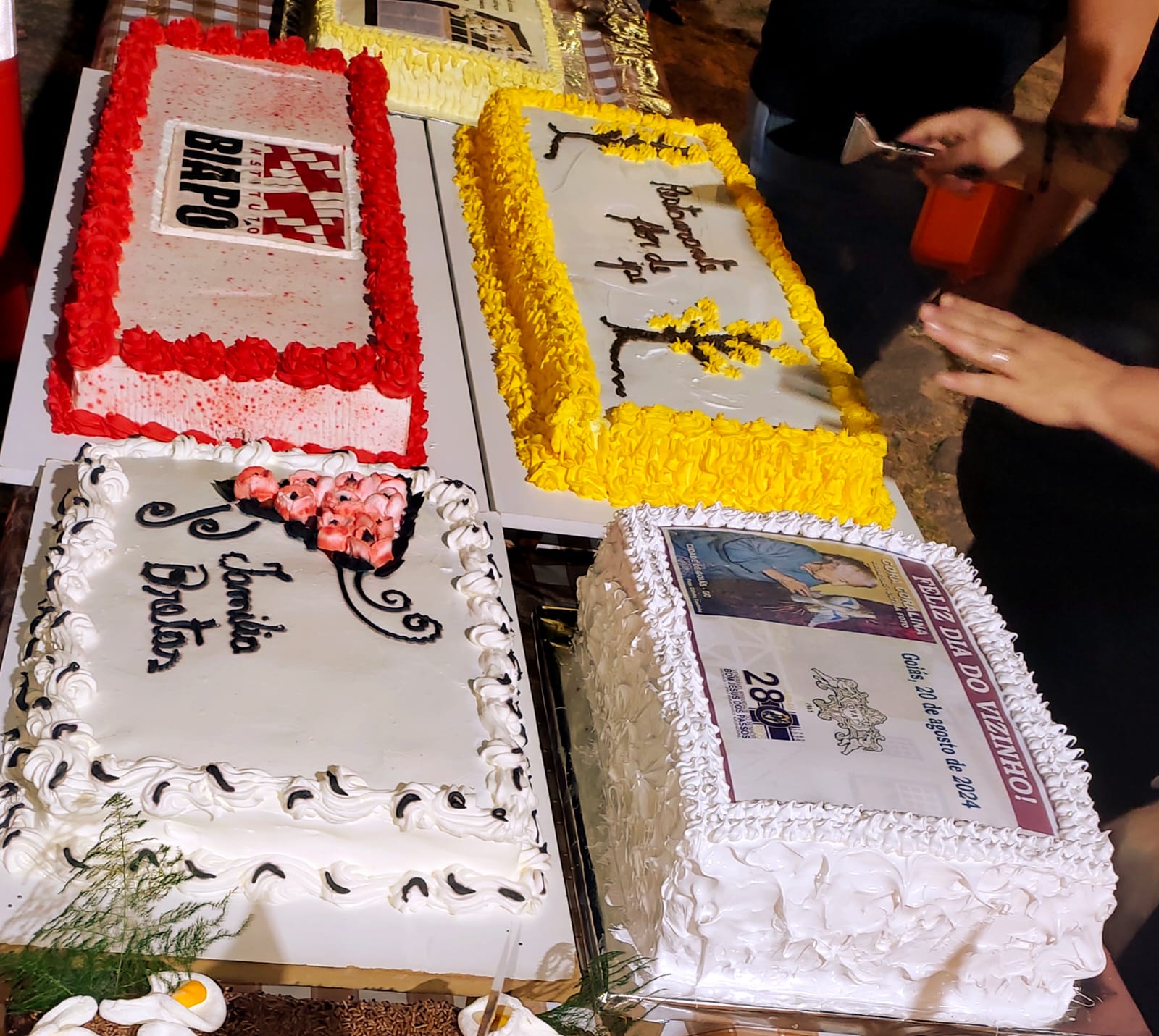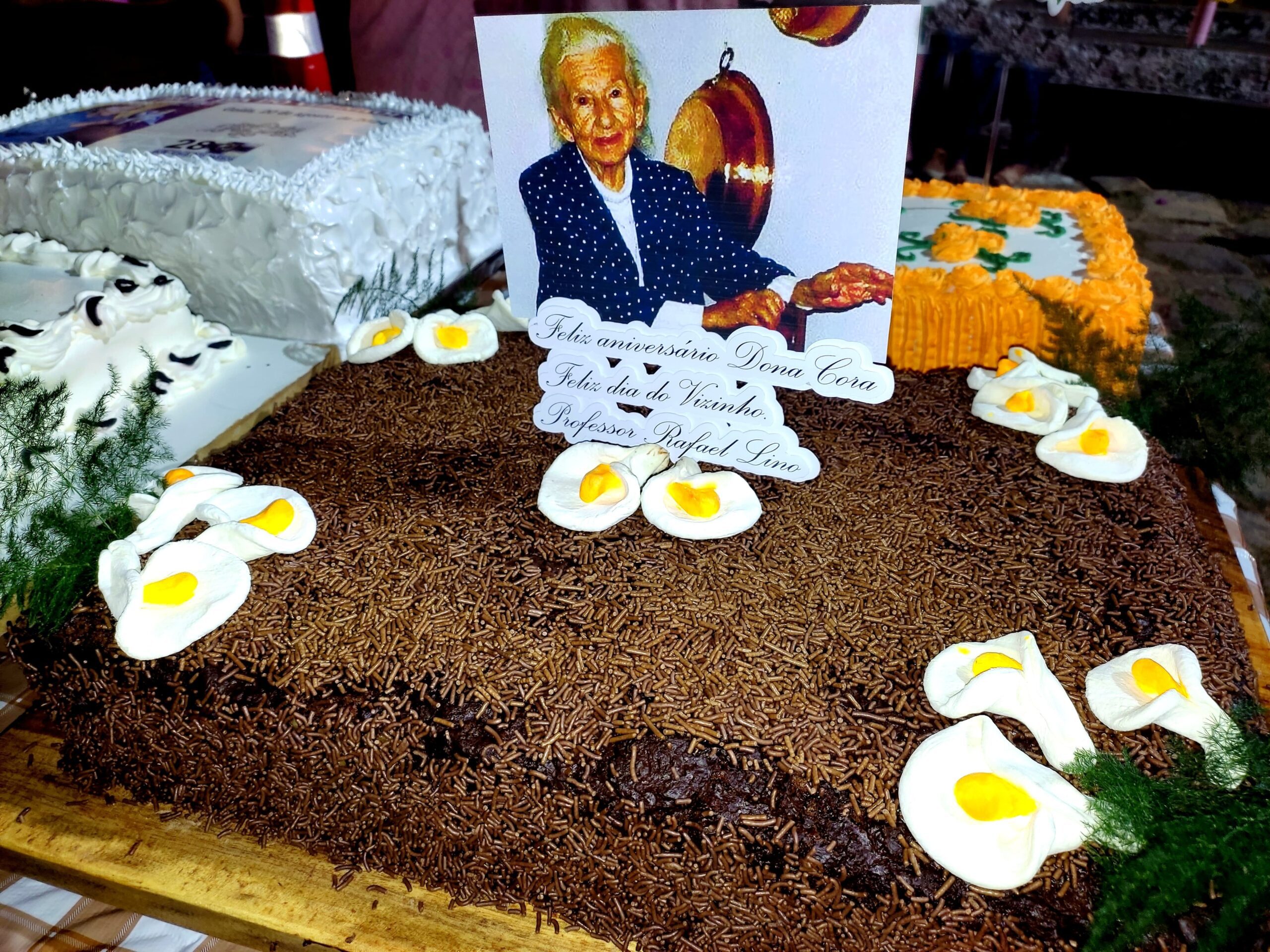 Após os parabéns, cantados pelo coro de vizinhos e amigos que estavam no largo, justamente com cantor Welington Piau, foi servido os pedaços de 10 bolos, doados pela comunidade e instruções vilaboenses.