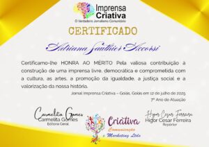 Por tudo isso, o Jornal Imprensa Criativa tem a honra de homenagear Delegada Adriana Accorsi, reconhecendo sua trajetória admirável, sua atuação combativa e ética, e tudo o que ela representa para o presente e o futuro de Goiás.