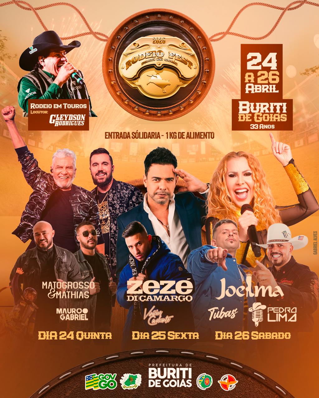 No Sábado(26/04), acontece a final do 3º Buriti Rodeio Fest, com a premiação em seguida. E tem a Joelma, com a turnê Isso é Calypso, fazendo o primeiro show do Estado de Goiás deste ano de 2025, para abrir o show da Rainha do Calypso, o locutor Pedro Lima anima o público, encerrando a programação com o DJ Tubas.