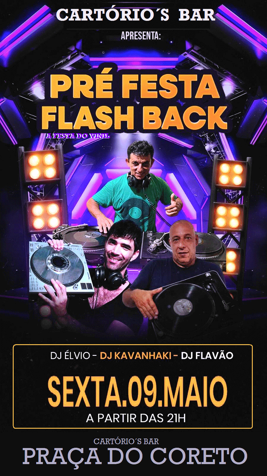 Na sexta-feira(09/05, ás 21h, tem a pré festa Flashback, a Festa do Vinil, o evento acontece no Cartórios Bar, em frente a Praça do Coreto e conta com os Djs Flavão, Elvio e Kavanhaki. O evento é gratuito.