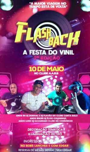 No sábado(10/05) tem a 2ª edição do evento que reúne músicas dos 80, 90 e anos 2000, no Clube da AABB, o Flash Back, a Festa do Vinil, a partir das 22 horas. Os DJs Dorival e Flavão tocam sucessos dos anos 80 que embalaram o Club Canta Galo, o DJ Elvio relembra os sucessos da década de 90 e o DJ Kavanaki traz as musicas marcaram os anos 2000.