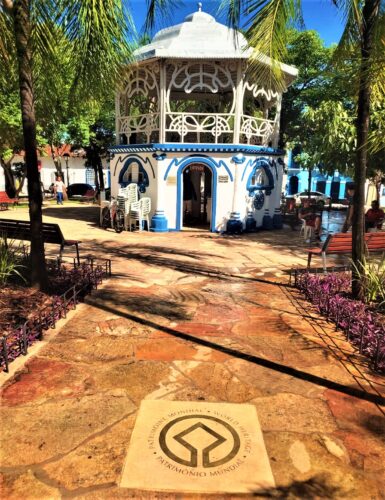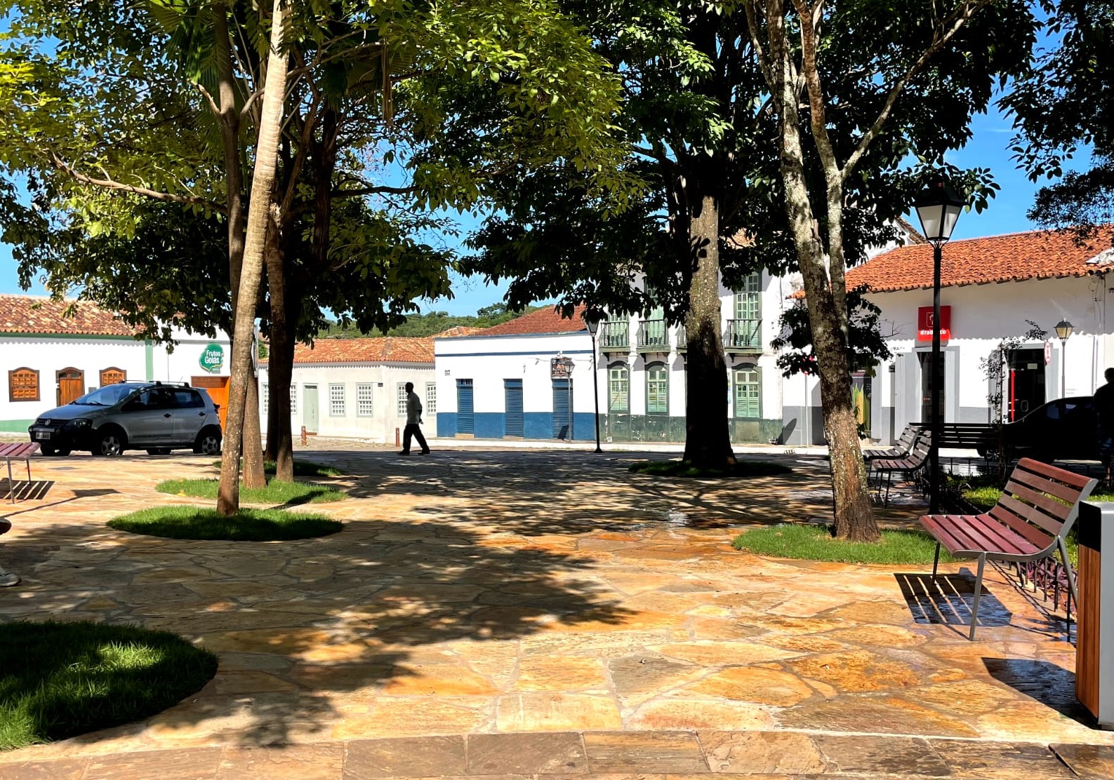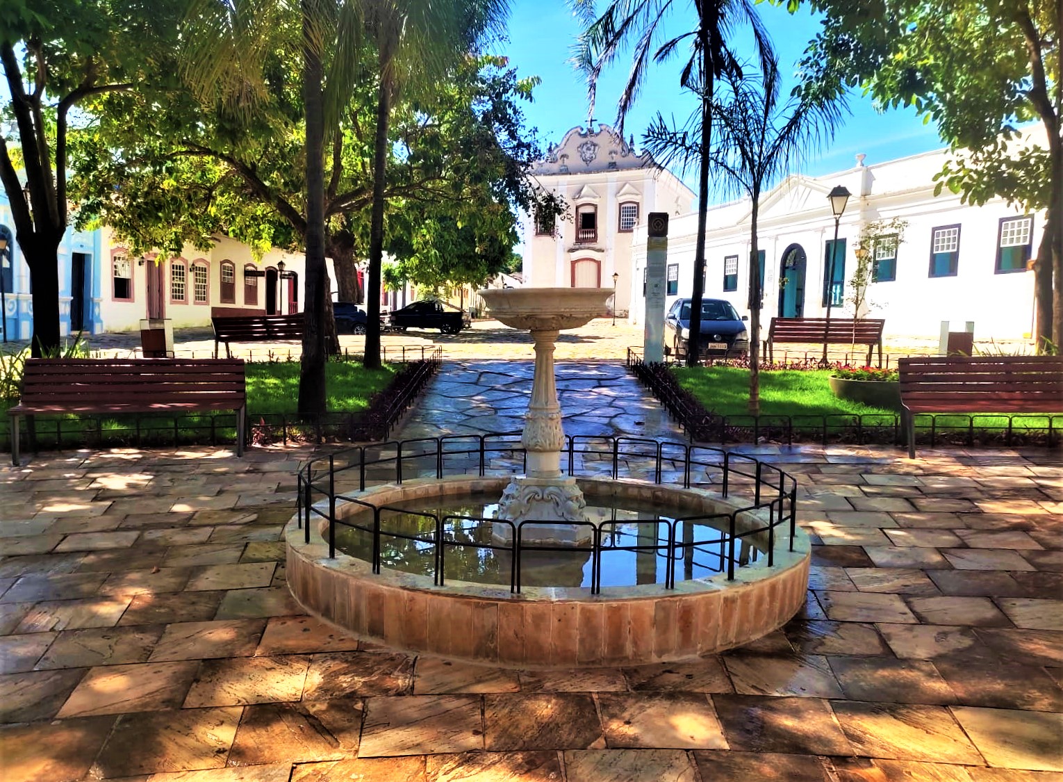 A fonte da Praça do Coreto também passou por reforma e ganhou uma nova iluminação, que à noite recebe um tom azul, destacando o espaço e contribuindo para a valorização estética do local