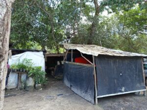 A precariedade das condições de moradia também faz parte da rotina. Maria das Graças Alves Ferreira e o esposo, Antônio Manoel dos Santos, estão há dois anos no acampamento e vivem em um barraco de lona simples, dividido em apenas um quarto, cozinha, banheiro e uma pequena área na frente.
