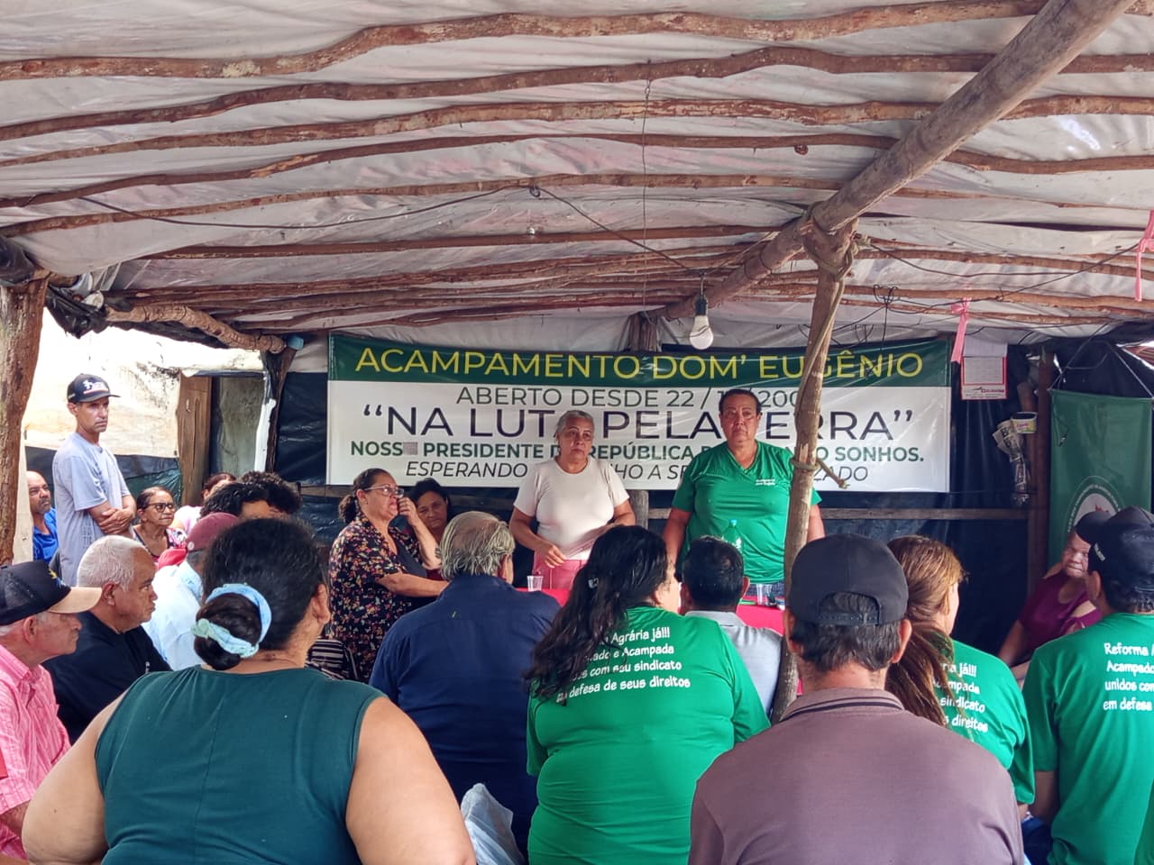 Há anos vivendo debaixo de lonas, famílias acampadas no Acampamento Dom Eugênio seguem aguardando uma resposta definitiva sobre a liberação das terras. Homens, mulheres, jovens e idosos compartilham uma mesma expectativa: conquistar um pedaço de chão para plantar, trabalhar e garantir dignidade.