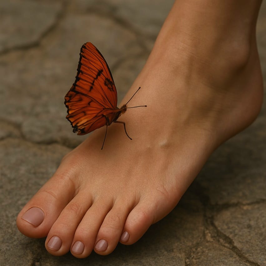 Era uma borboleta: a “borboleta-do-maracujá”. Quando sacudi e olhei, vi-a ser lançada do meu pé até o chão. O inseto, inofensivo, de asas tortas, se esforçava numa caminhada cambaleante. Minha pequena afilhada, atenta ao meu movimento brusco, seguiu meu olhar assustado e disse, com voz doce: “É uma borboleta. Ela tá machucada.”