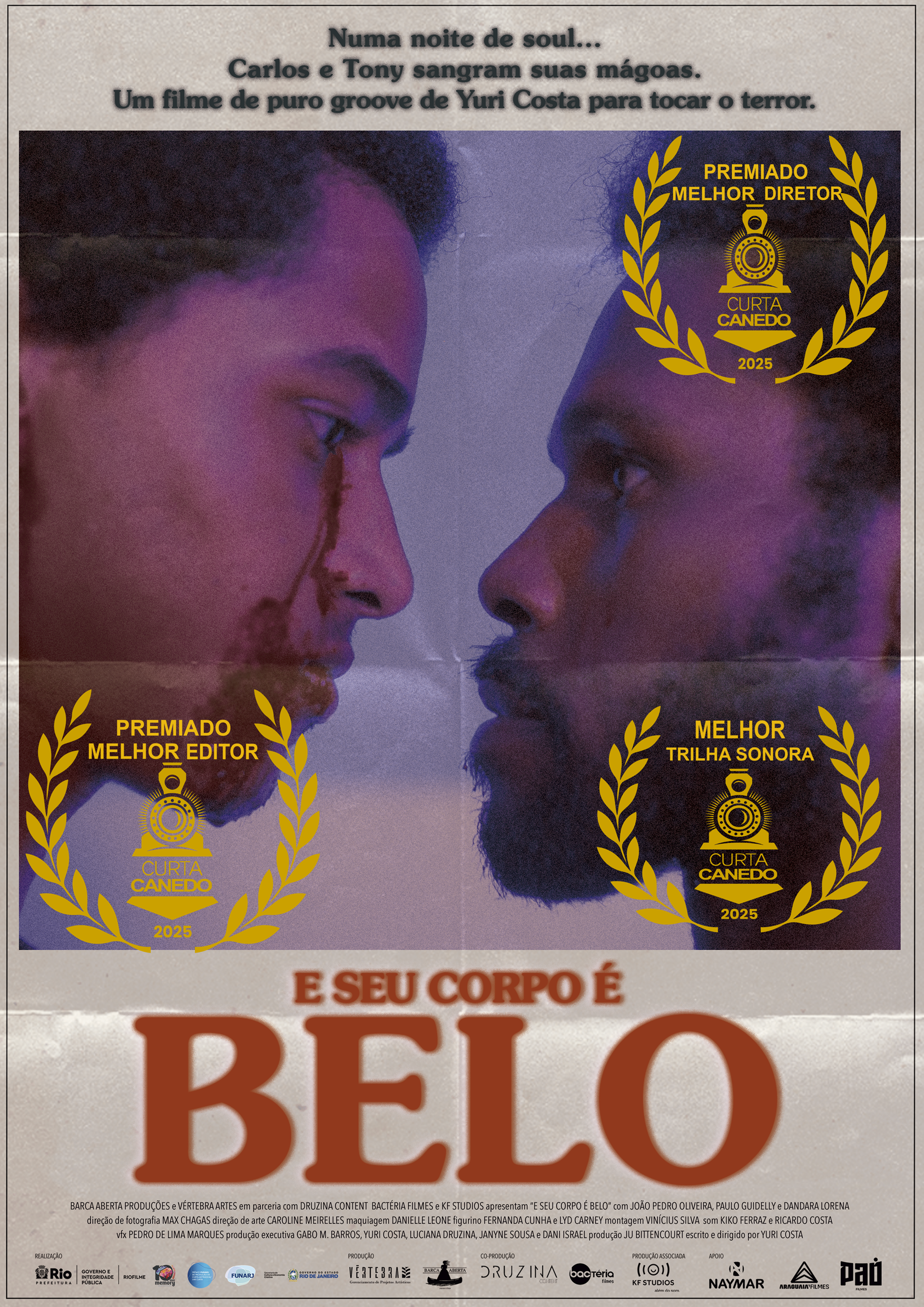Numa noite de soul… Carlos e Tony sangram suas mágoas. Um misto de terror, romance e musical, em E SEU CORPO É BELO, é década de 1970, em meio às festas Black no subúrbio carioca, quando Carlos reencontra seu ex-namorado Tony acompanhado de outra pessoa, reacendendo mágoas embaladas pelo soul. Gênero: Ficçaõ, musical, fantasia, romance e lgbrqia+