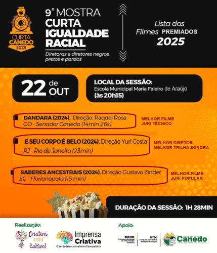Sessão 22 de outubro de 2025 19:30 horas - Periodo noturno- Público: Alunos Matriculados na EJA com Idade de 16 a 70 anos - Escola Municipal Maria Faleiro de Araújo (Vamos publicar nota de repudio e BO contra o comportamento da Coordenação do Turno Noturno desta Escola, ois exerceu censura, aliciou alunos à homofobia, racismo e intolerancia religiosa, interferindo e prejudicando a Mostra Curta Igualdade Racial) Produção: Carmelita Gomes e equipe de Curadores e Juris Realização: Criativa Studio Cultural Parcerias: Prefeitura Municipal de Senador Canedo - Sitec - Secom