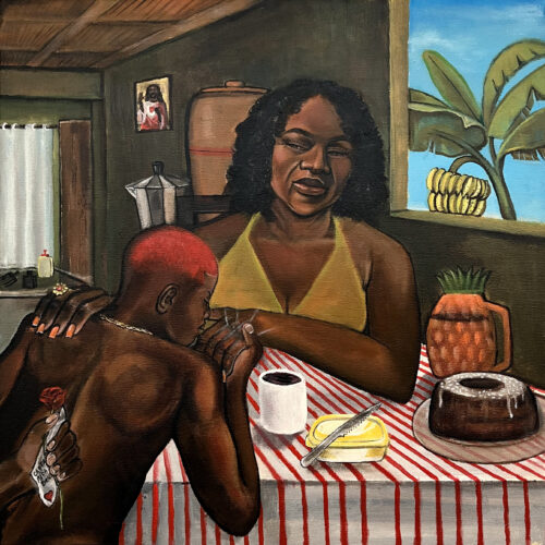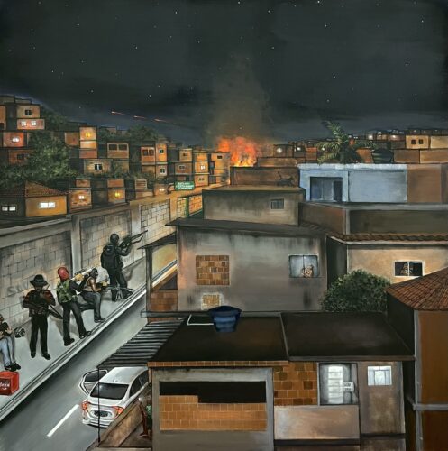 Em sua fase mais recente, Jota incorpora elementos visuais do pan africanismo às telas. Suas obras passam a ser atravessadas pelas cores da bandeira do movimento criada em 1920 – o vermelho que representa o sangue, o preto que simboliza a pele e o verde que remete à fertilidade africana – estabelecendo uma ponte estética e simbólica entre os quilombos, as periferias urbanas contemporâneas e os movimentos globais de libertação.