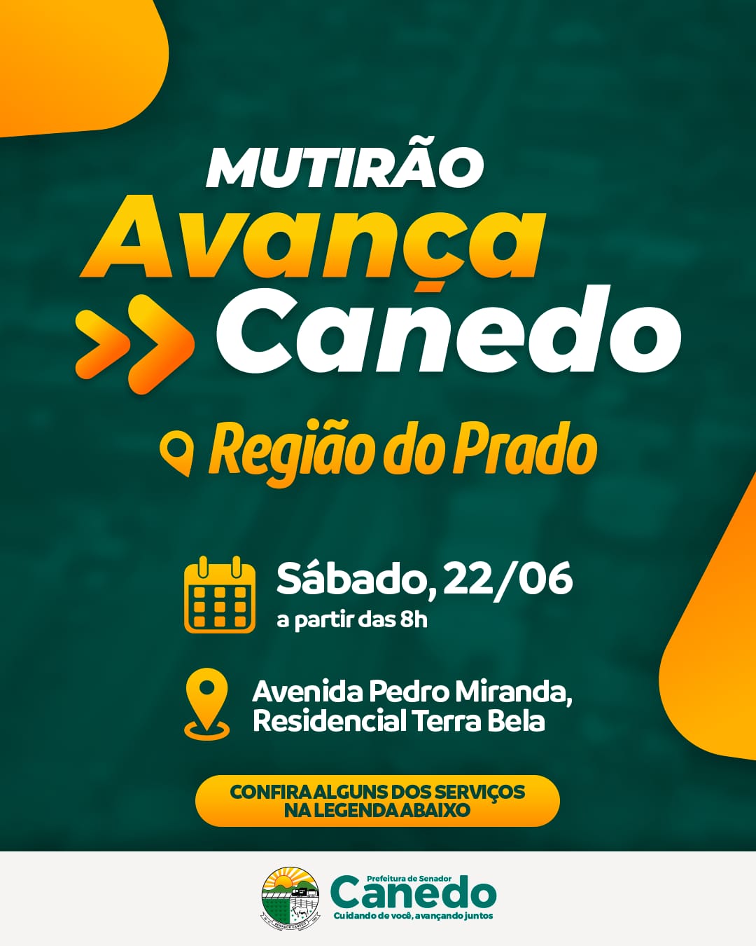 A Prefeitura Municipal de Senador Canedo realiza neste sábado (22), no Residencial Terra Bela, a sétima edição do Avança Canedo, o maior mutirão de serviços que levará até a população da região mais de 70 serviços totalmente gratuitos de todas as secretarias do município. O atendimento acontece das 8 às 16 horas.