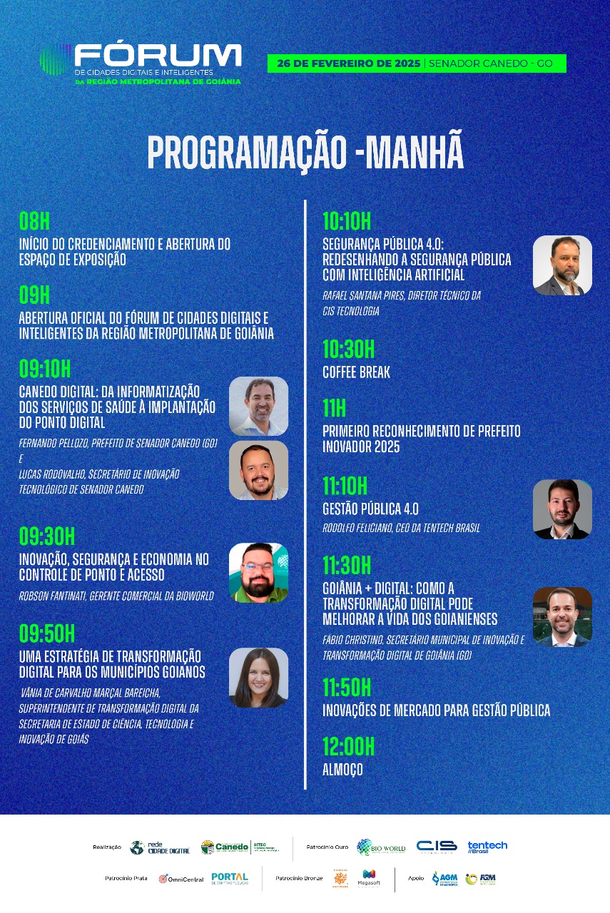 As inscrições para o Fórum de Cidades Digitais e Inteligentes da Região Metropolitana de Goiânia são gratuitas para servidores públicos, vereadores, entidades e universidades e devem ser feitas pelo sympla.com.br/rcd. As vagas são limitadas.