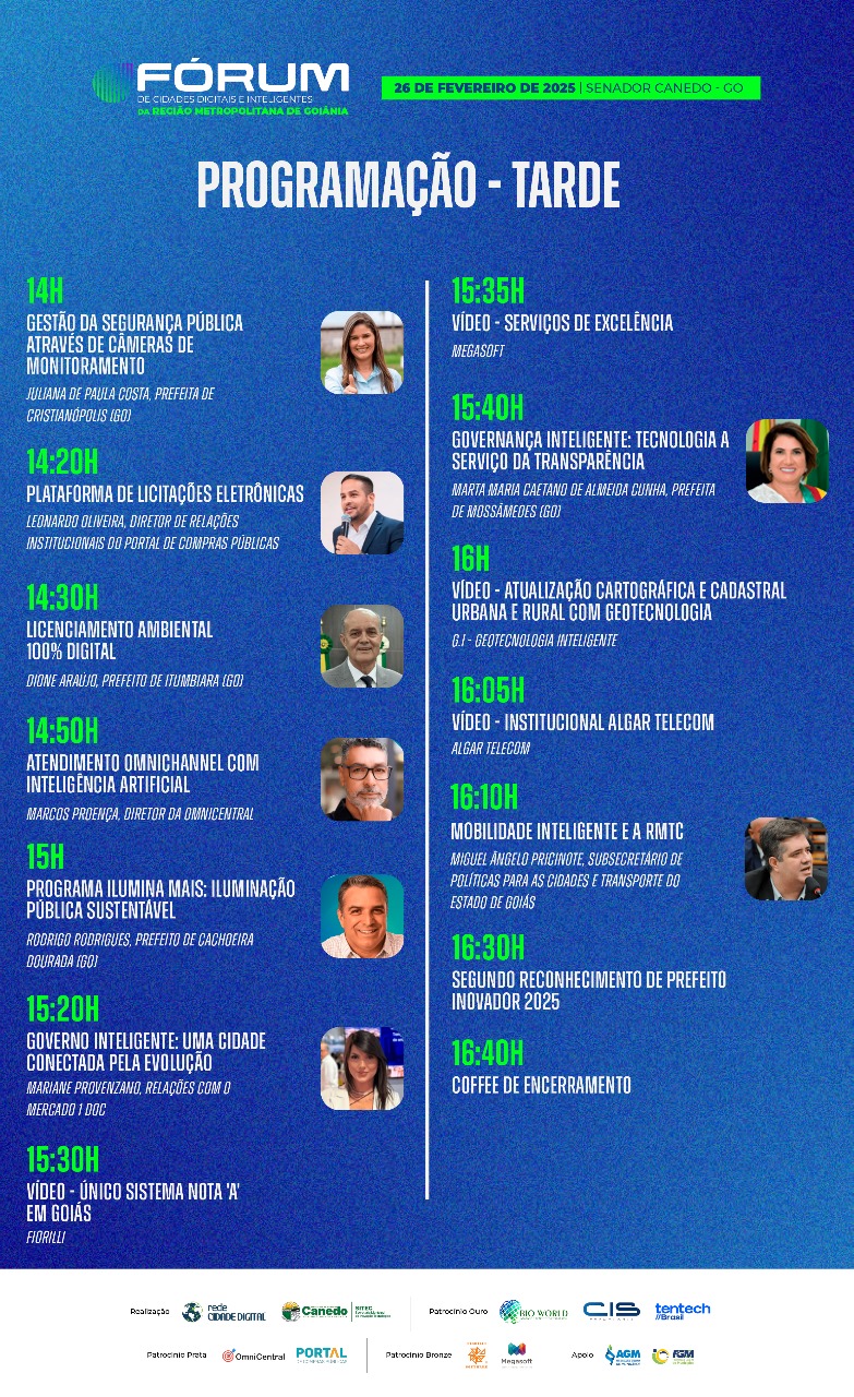 As prefeitas de Cristianópolis, Juliana Costa, e de Mossâmedes, Marta Caetano, e os prefeitos de Cachoeira Dourada, Rodrigo Rodrigues, e de Itumbiara, Dione Araújo, também mostram como as cidades investem em tecnologia na modernização da máquina pública. O Secretário Municipal de Inovação e Transformação Digital de Goiânia, Fábio Christino, destaca as ações para transformar a capital do Estado referência nacional em inovação e gestão eficiente. Outra convidada confirmada é a Superintendente de Transformação Digital da Secretaria de Estado de Ciência, Tecnologia e Inovação de Goiás, Vânia de Carvalho Marçal Bareicha, que apresenta as estratégias de transformação digital do Estado para os municípios goianos.
